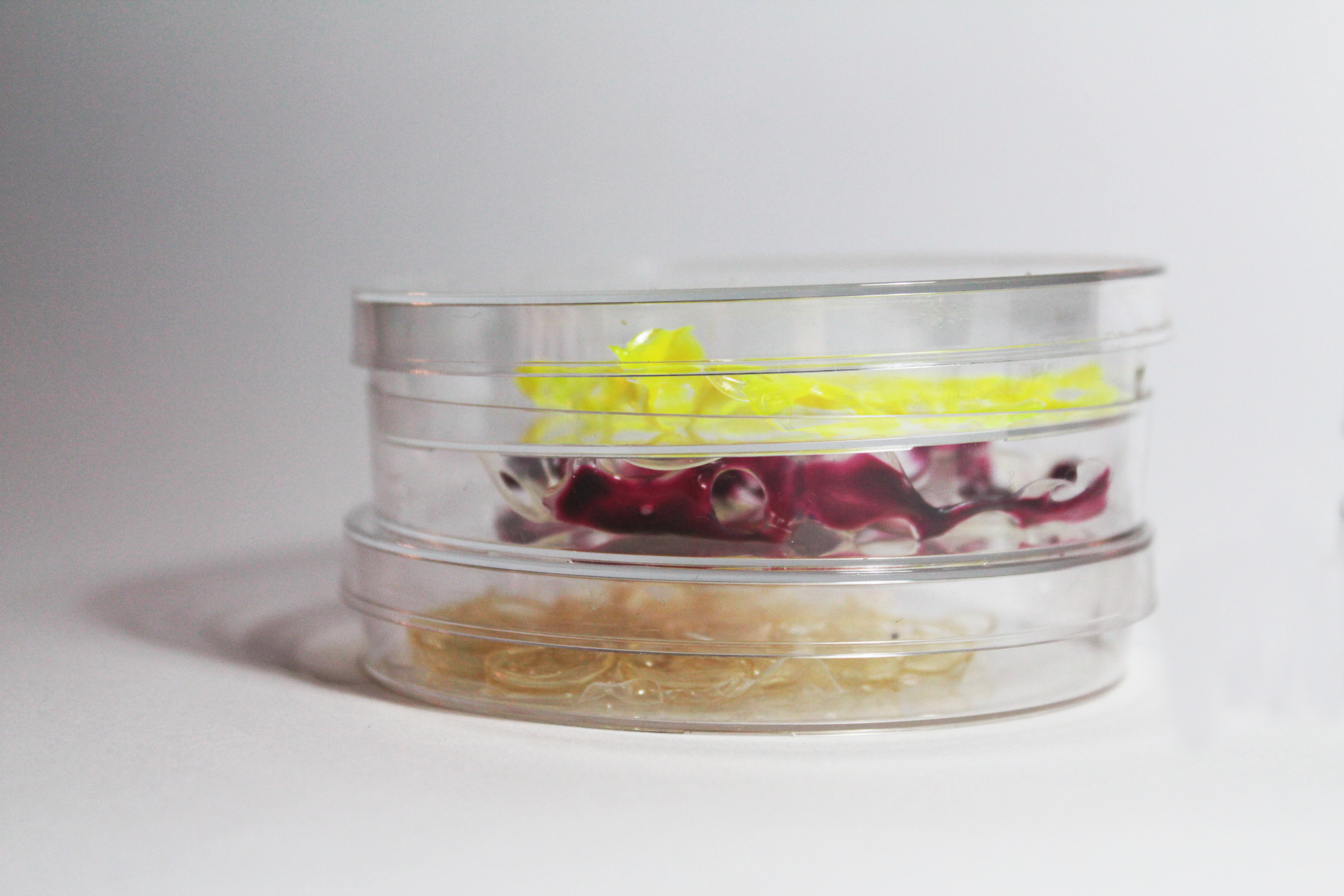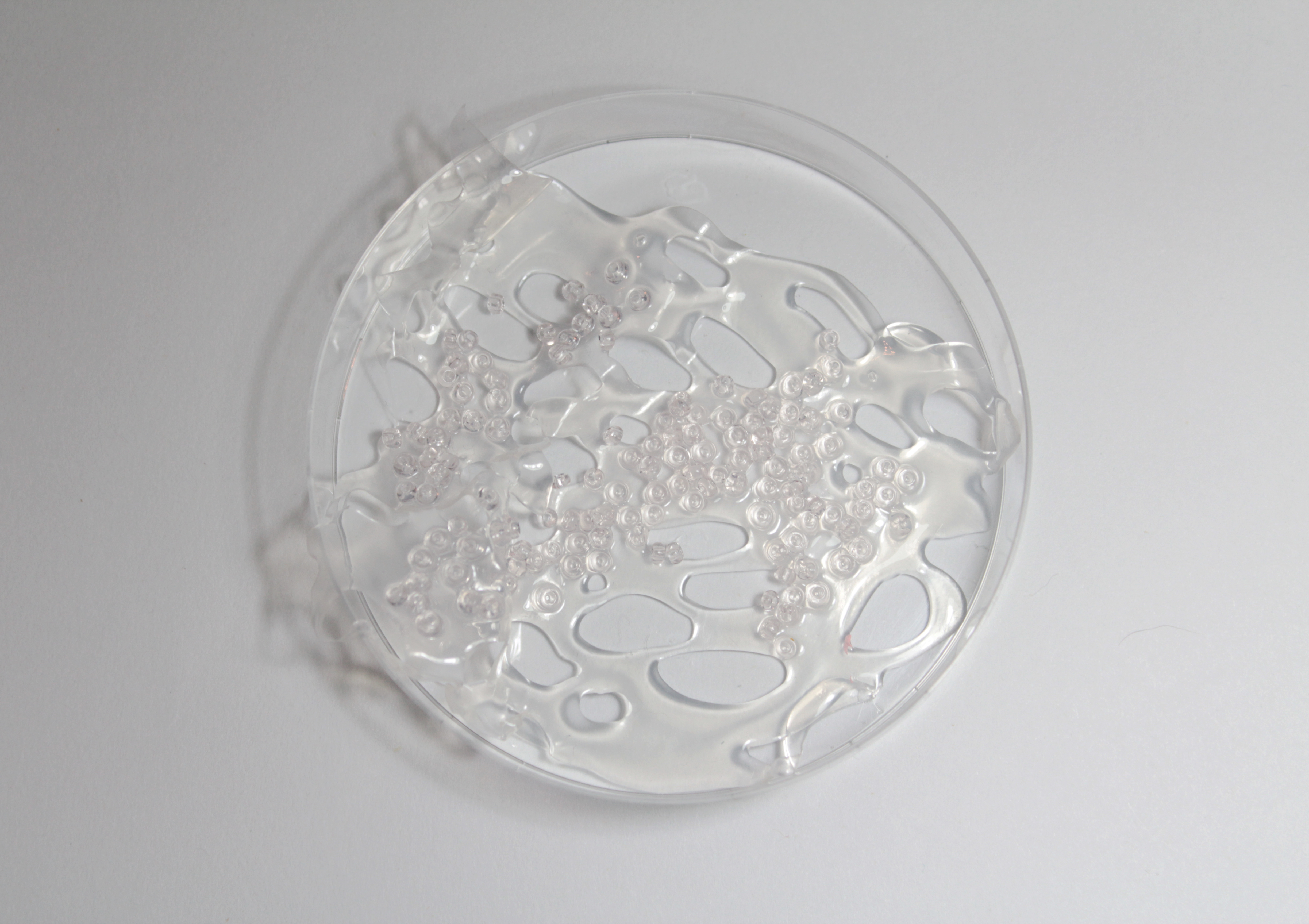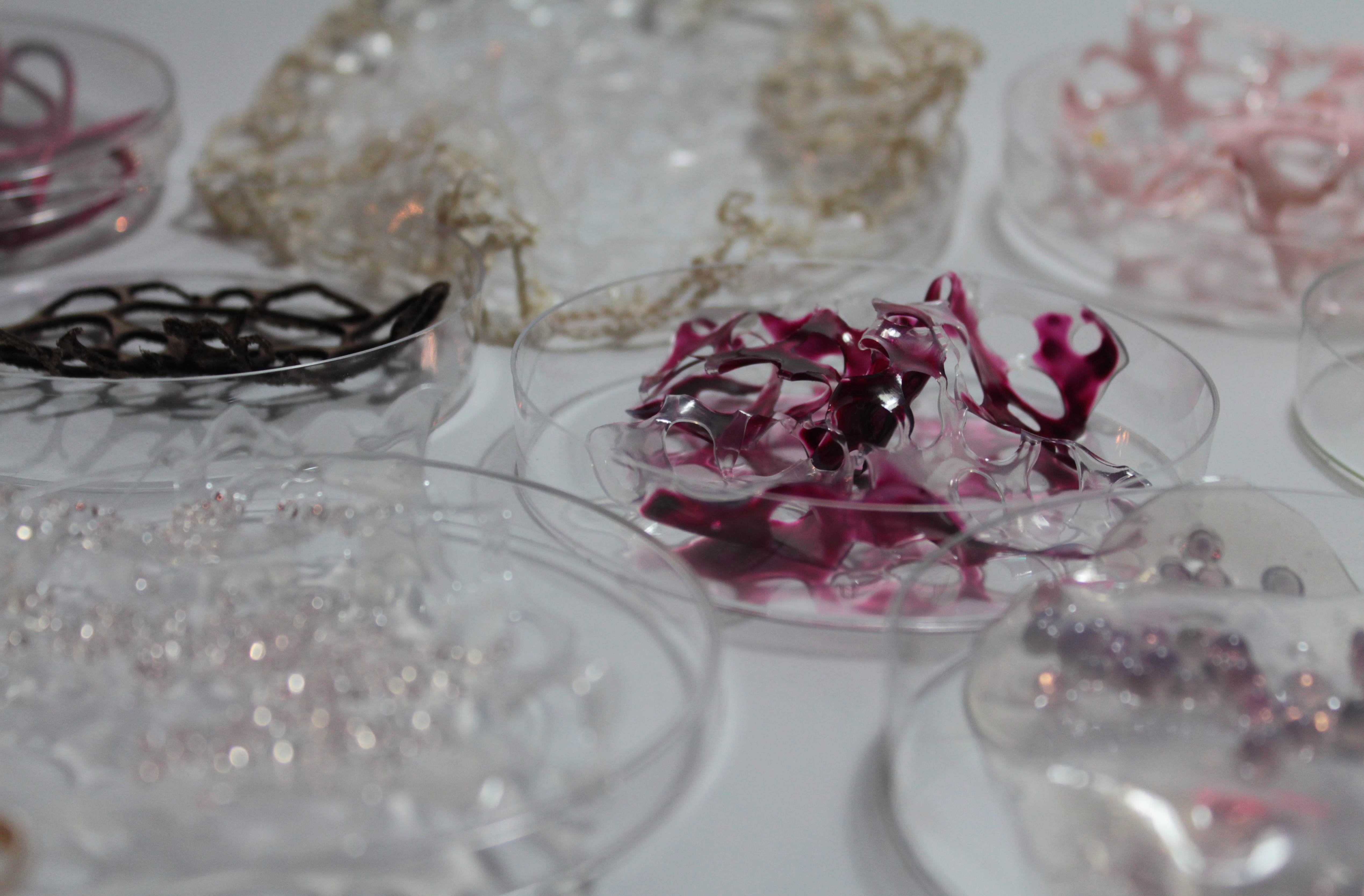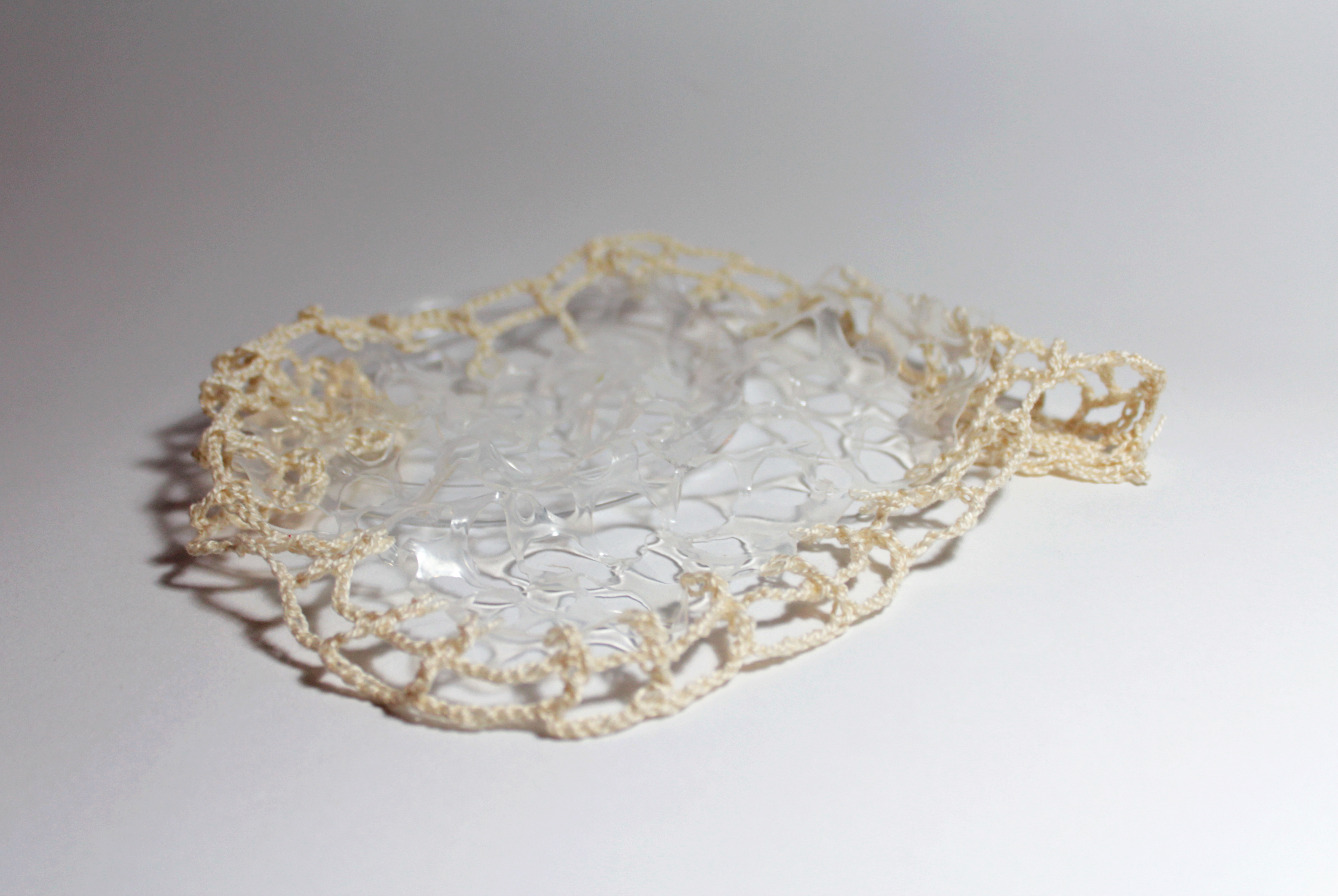 Plastidermic is a project of material exploration inspired by microbiology. This work is based on the relationship established with the structure of textiles, researched in previous works. The process involved an exploration of traditional textile techniques such as crochet and dyeing, merging with materials that resemble cellular structures and patterns of cellular reproduction.